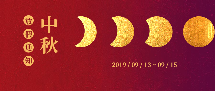 中秋节将至,根据《国务院办公厅关于2019年部分节假日安排的通知》,结合公司实际,现将2019年中秋节放假安排相关事宜通知如下:2019年9月13日至15日放假,共3天,无调休。预祝公司全体员工中秋节幸福安康、阖家团圆!